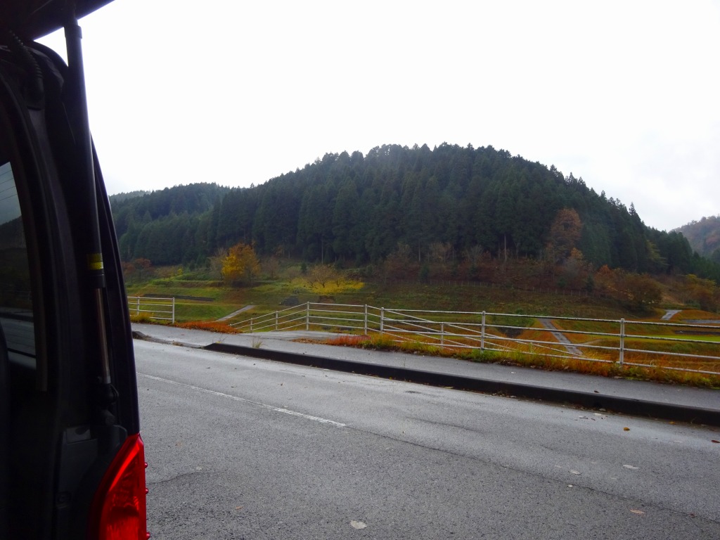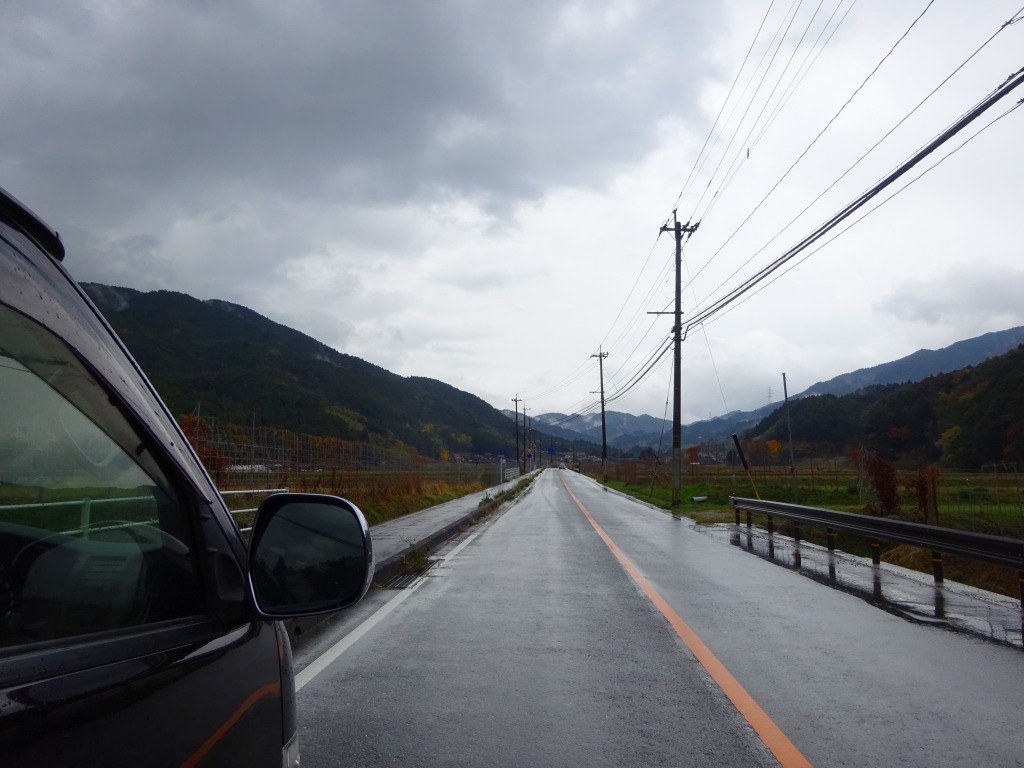 濡れた路面、車でも落ち葉で滑る。