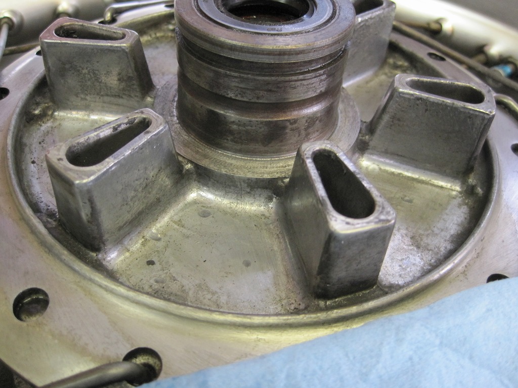 リアハブ、ブレーキシュー当り面は磨耗が進むと交換が必要です。