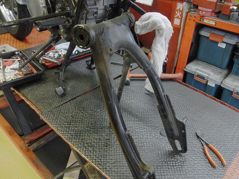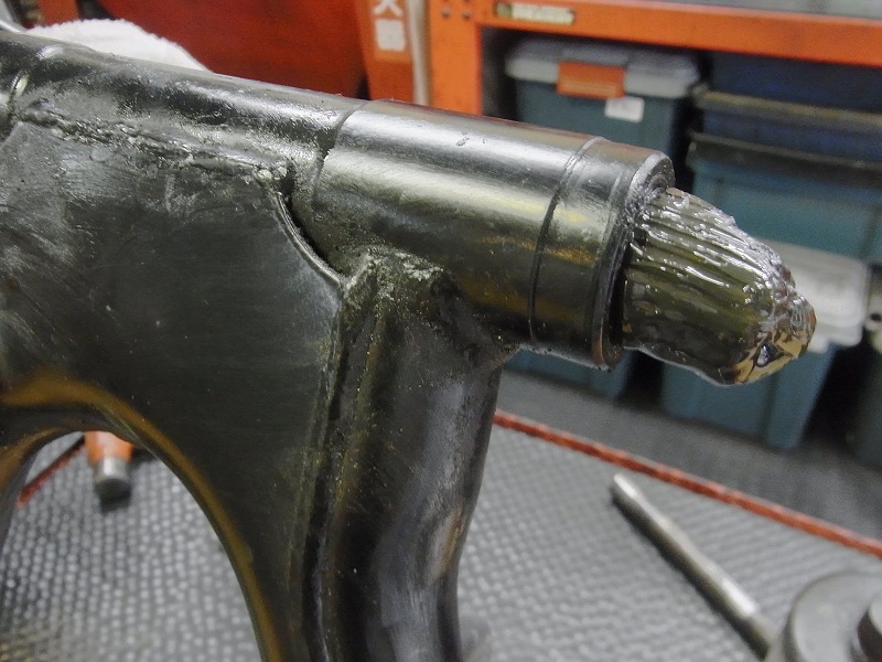 スイングアームのダストシールが抜け、グリスが出ておりました。