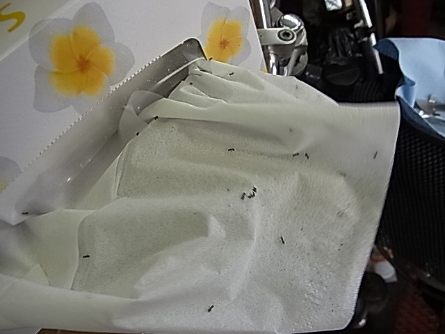 キャリパーのブリードスクリュ内フルードを吸い取ろうとテッシュを。