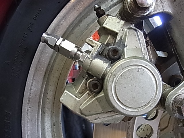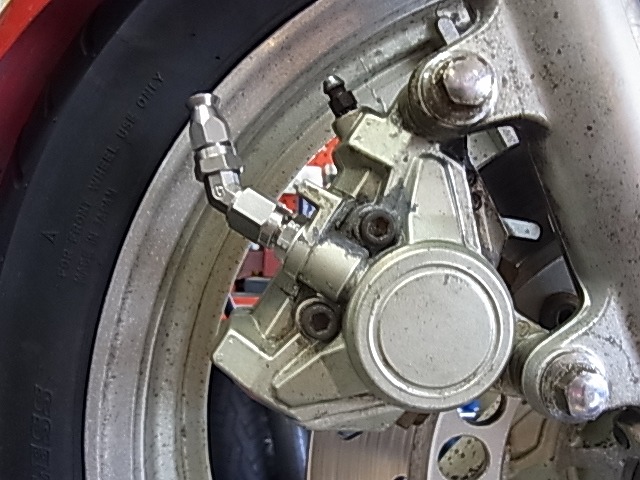 キャリパー側フィッティング、スイベル仕様でホースのひねり調整が可能です。