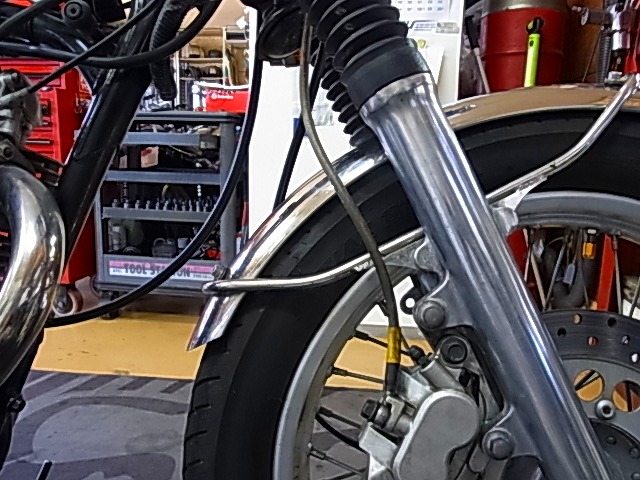 整備の為にセンタースタンド、ブレーキホースが伸びきりパツンパツン状態。