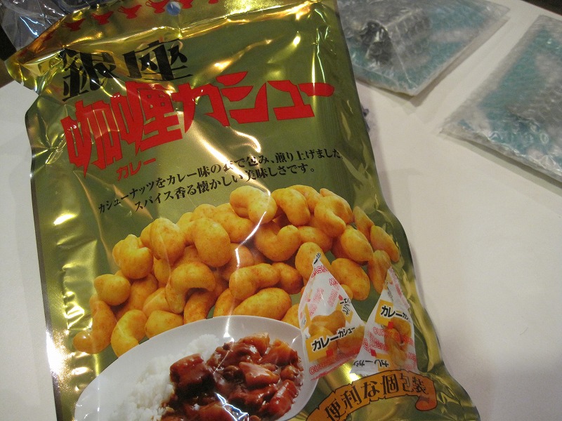 渋々?お土産袋から「銀座 伽厘カシュー」を取り出すU様(笑)