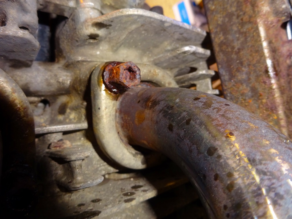 オイルクーラー上部取り付けボルト固着、下から抜きます。