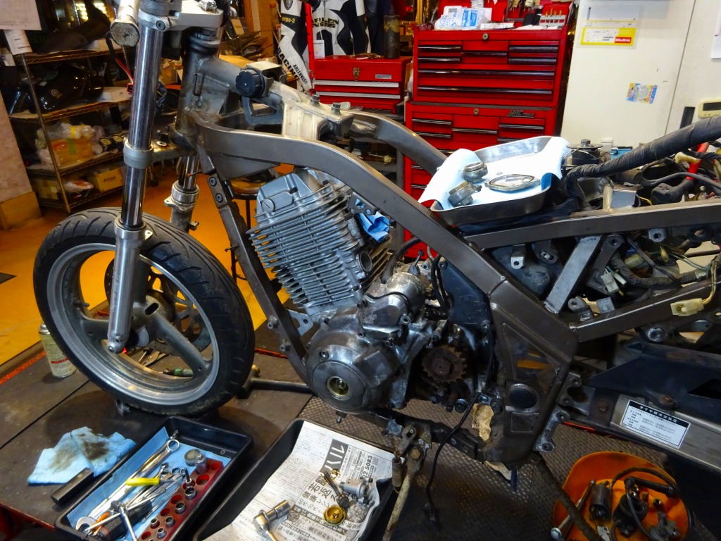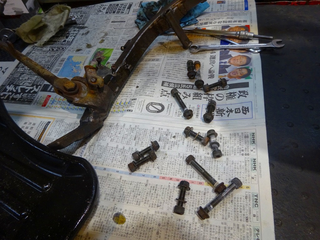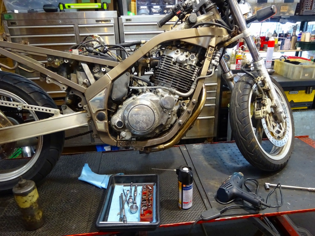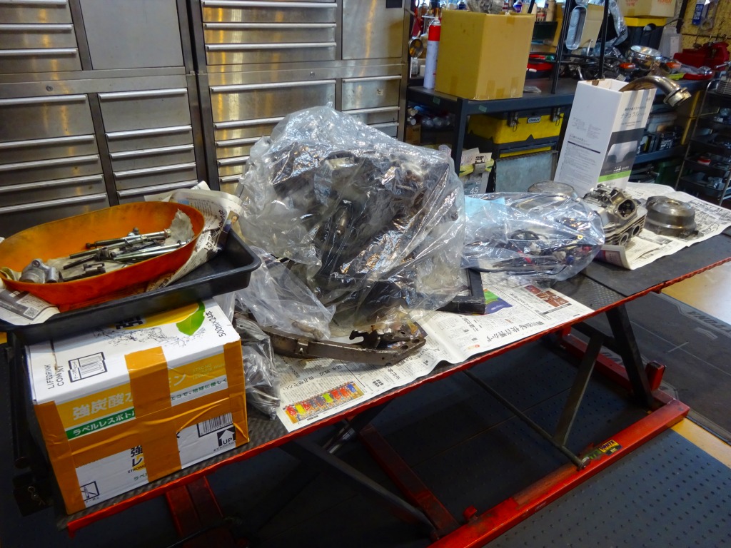 エキパイ問題が解決する迄の間、車体回りの分解に着手。
