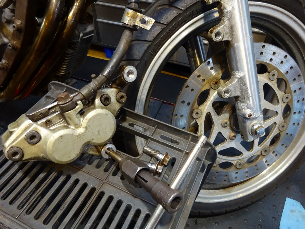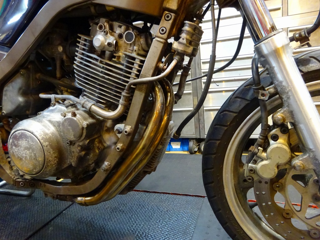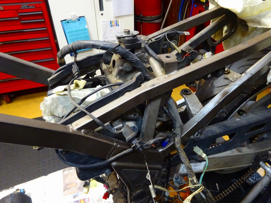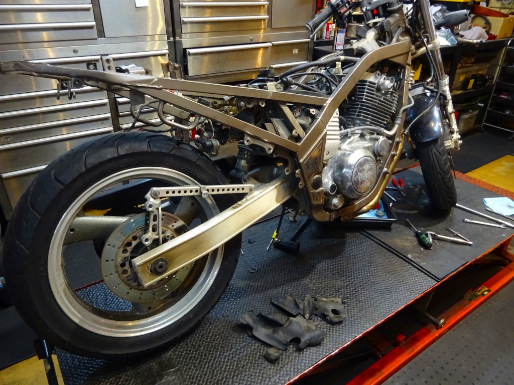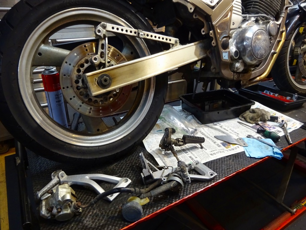 エキパイ問題が解決する迄の間、車体回りの分解に着手。