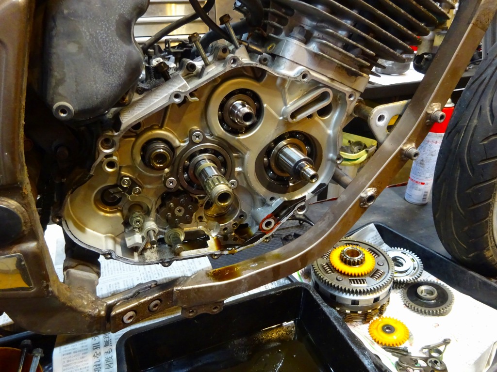 エンジン内に残ったオイル、降ろす際にこぼれない様ケースカバー仮付け。