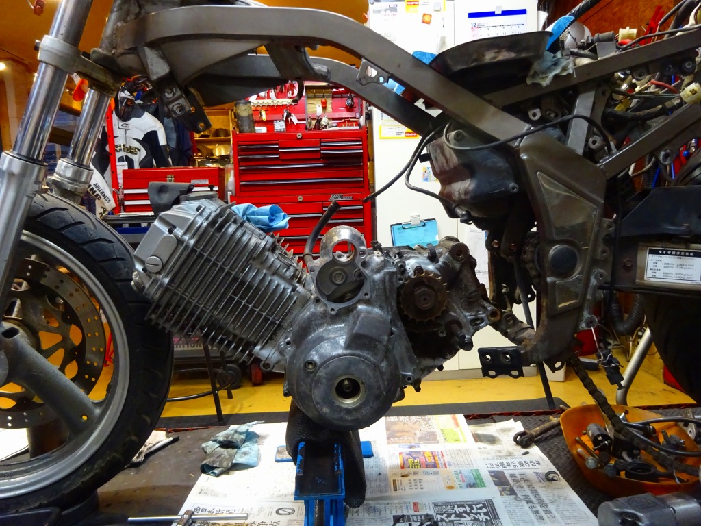 エンジン全分解ですのでサイド部品を取り外し、エンジン単体を軽くしておく。