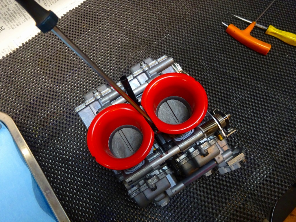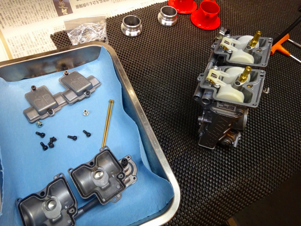 FCR39パイ2連キャブレター装着準備に取り掛かる。