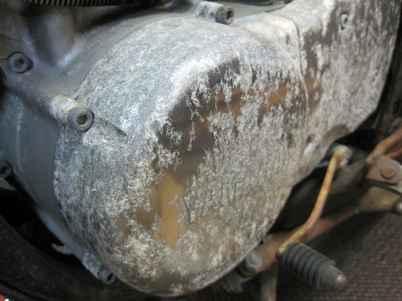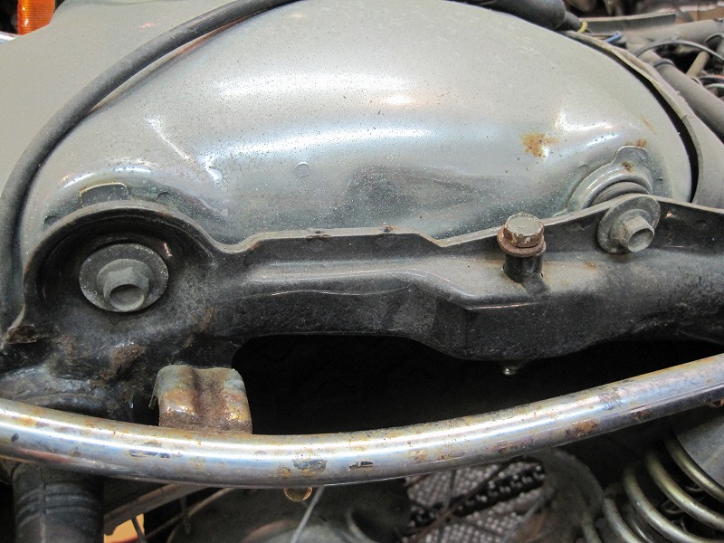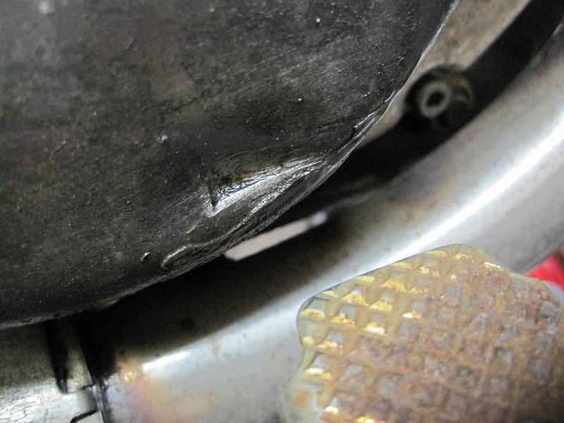 ケースカバー、前オーナー様の転倒によるダメージ!オイル滲み確認。