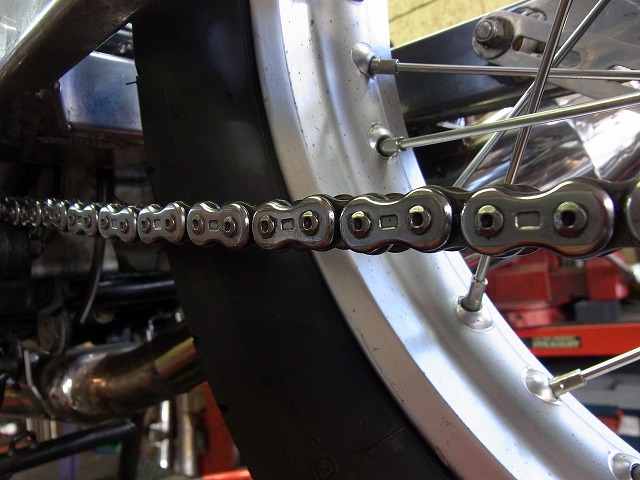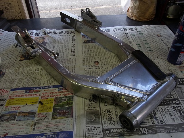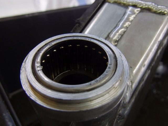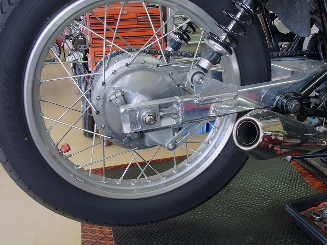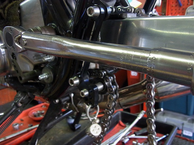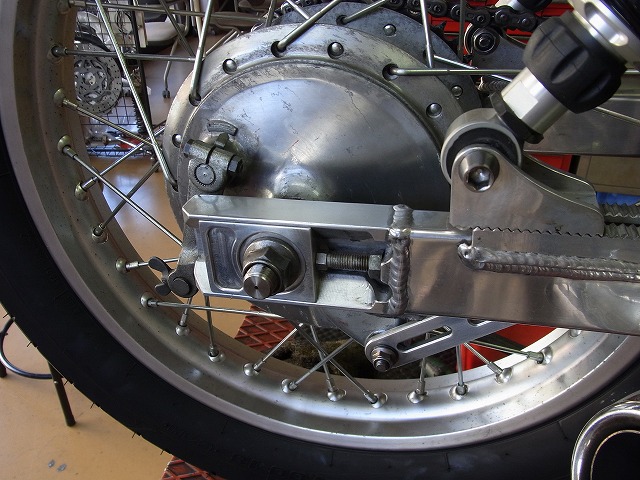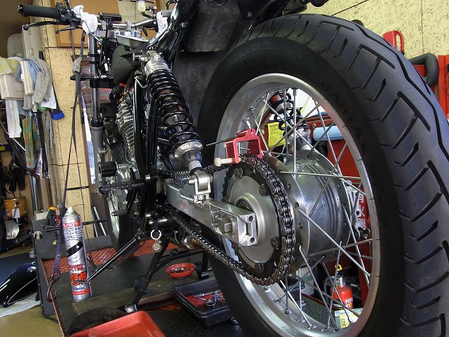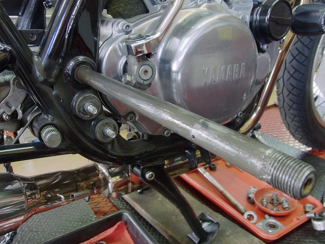 固定確認するときにリアタイヤを左右に揺するとスイングアームが動きます…。