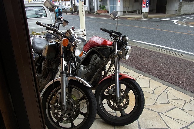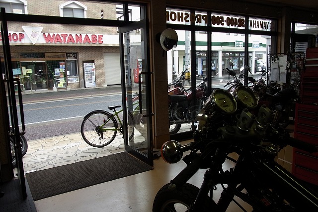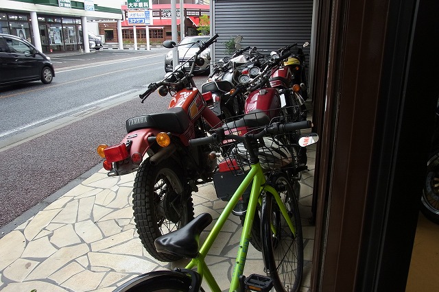 風が強くお客様のバイクは店内、店外軒下には当店在庫SR。